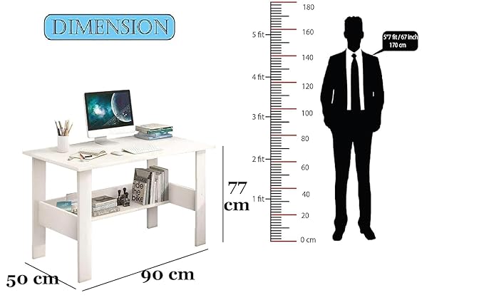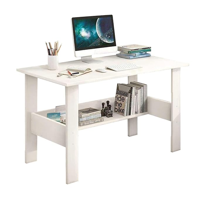 This compact white study table offers a spacious top for your computer and a convenient open storage shelf below for books and essentials. Its durable, modern design is perfect for any small workspace
